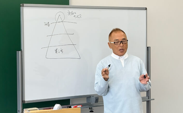 テーマに沿ってディスカッションを行い、社長の講義を聴きます。